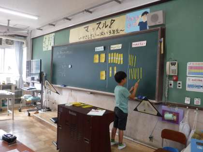 数え棒を使って,繰り上がりや繰り下がりの方法を説明できるようにしています。