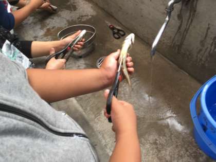 一人ひとり自分の捕まえた魚を調理しました。