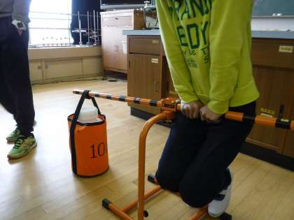 重たいものを持ち上げるにはどのようにしたらよいのかを考えながら