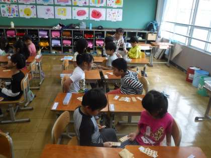 「いっせーのーで」という掛け声で,同時にカードを出し,楽しく比べ合いながら,10までの数の大小比較をすることができました。