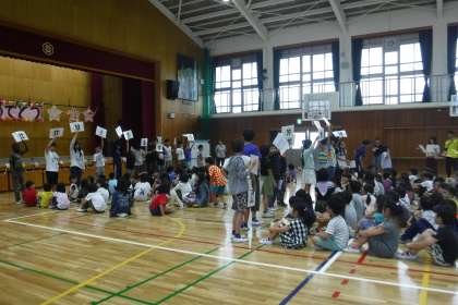 今回は1年生から6年生までが集まって,自己紹介をしました。