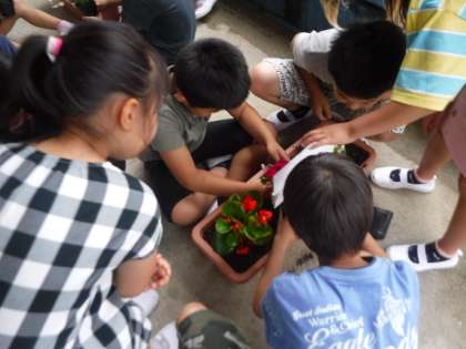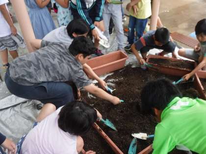 たてわりグループで花植えをしました。1〜6年生のグループのみんなで協力してベゴニア・日々草を3株植えました。その後は,トランプ等をして楽しい時間を過ごすことができました。