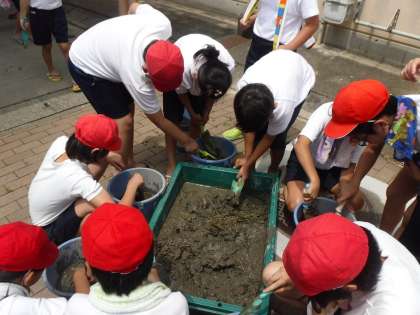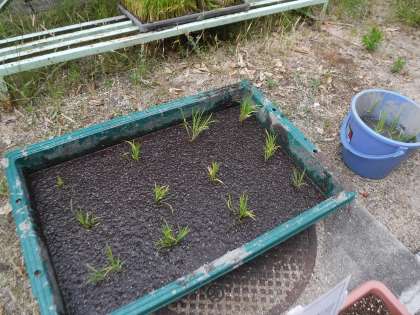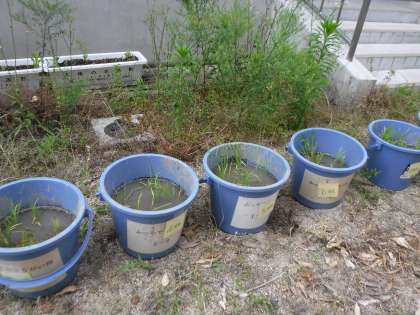余った稲をもらってきて学校で苗を育てることにしました。グループで協力してバケツに植えました。体育館横に並べていますので来校されましたら,またのぞいてみてください。