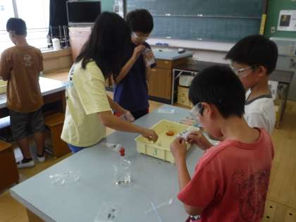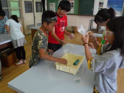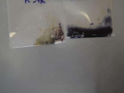 水とうどんを混ぜた袋,だ液とうどんを混ぜた袋,それぞれにヨウ素液を入れて様子を観察しました。