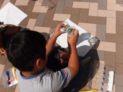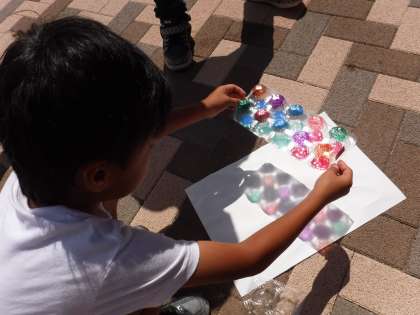 透明の容器に色を付け,光を透かして楽しみました。国語科「スイミー」に登場する「にじいろのゼリーのようなクラゲ」とも重ねながら,想像を膨らませました。