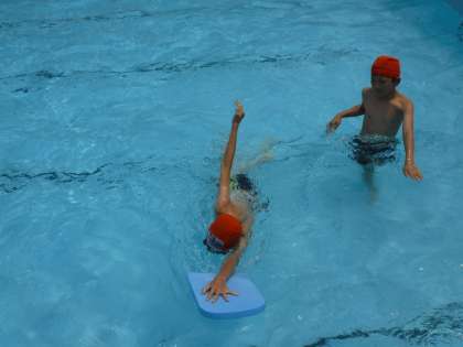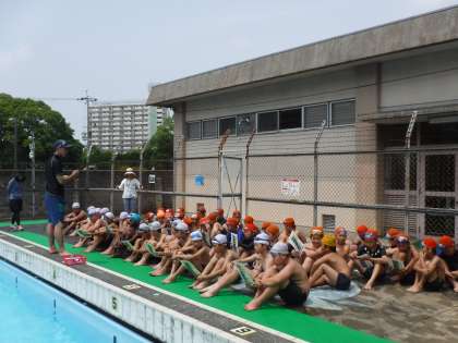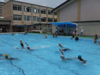 よいお天気の中,水泳学習も3時間目に入りました。自分たちで見合い,教え合い頑張っています。クロール・平泳ぎの息継ぎの仕方,手足の動かし方等少しずつスムーズにできるようになってきました。