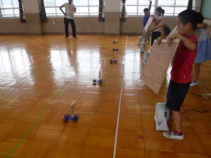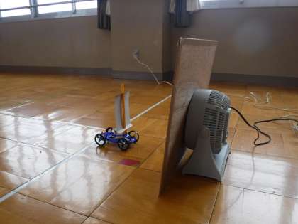 理科の学習では,車を使い風の力を調べています。