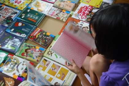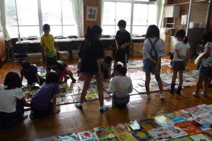 たくさんある本の中から,図書室においてほしい本を選びました。