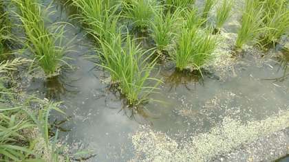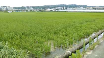 6月にみんなで植えた水田の苗がずいぶん大きくなりました。学校に持ち帰り育てている苗も同じように成長しています。順調な成長をみんなで喜んでいます。