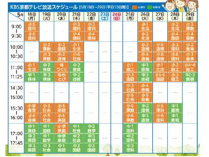 5月14・15日に各家庭に配布させていただきました「新型コロナウイルス感染拡大防止のための臨時休業期間の延長について」の裏面にKBS京都テレビでの「特別教育番組」放送スケジュールが掲載できておりませんでしたので、HPにてお知らせします。ご迷惑をおかけいたしました。訂正させていただきます。詳細は、KBS京都HPをご覧ください。