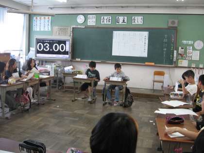 といった議題で討論をしました。それぞれ,説得力のある話し方ができるよう,準備段階から話し合いました。当日は,司会や記録・まとめ役になった子も,一生懸命取り組みました。質疑応答も充実し,なかなか面白い討論会になりました。