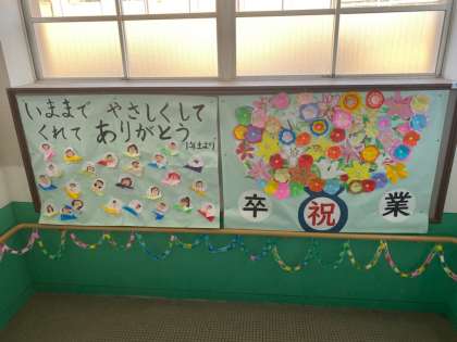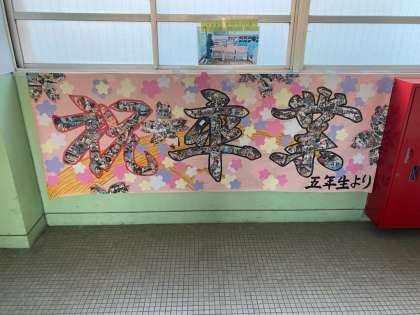 卒業式まであと少しとなりました。下級生から,卒業する6年生に向けて,掲示板や廊下を飾ってくれています。下級生の気持ちがいっぱい詰まった作品が卒業を祝ってくれています。
