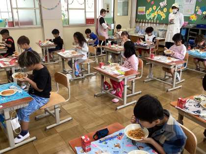 初めての給食で食べられるか不安な子もいたようですが,「りんごゼリーがシャーベットみたいでおいしい!」など,喜んで食べる姿が見られていました。