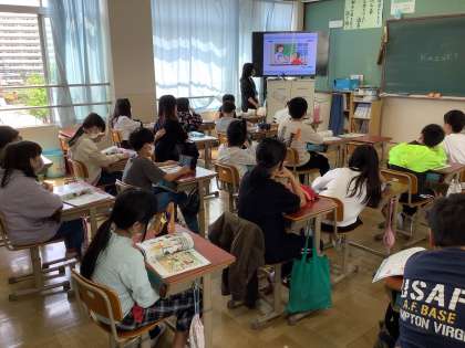 5年生での英語の学習が始まりました。映像を見ながら登場人物たちが何をしているのかを読みとっています。