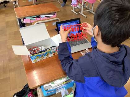 先生の説明を聞いたり,説明書を見たりしながら,苦労して組み立てていました。