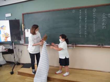 道徳の学習では,「金の斧」を題材に寸劇形式で考えました。欲張ることなく正直な心で答えることができました。
