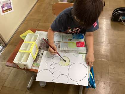色や水を混ぜて、シャボン玉を塗りました。みんな丁寧に慎重に塗っていました。綺麗な色のシャボン玉がたくさん出来ました。