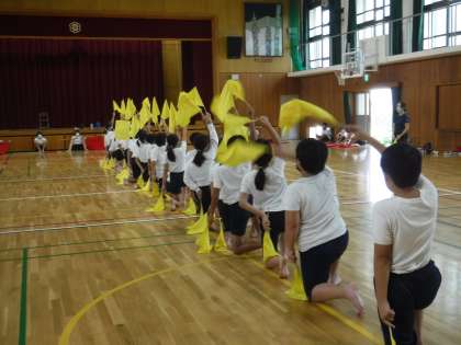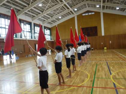 5年生も6年生も、使ったことのない旗の扱いに苦戦しています・・・。