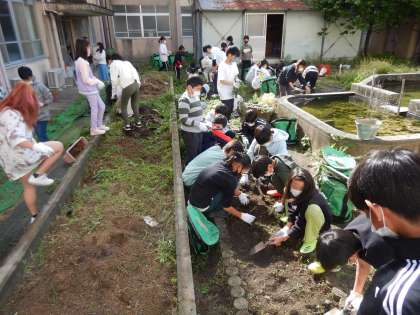 今朝の『たてわり活動』の時間は、高学年ユニット全員で協力をして「畑の草抜き」の作業を行いました。