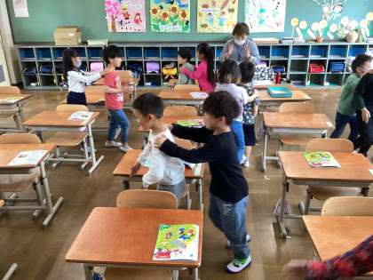 「かもつれっしゃ」の音楽に合わせて、じゃんけんしたり、繋がったり、楽しい時間を過ごしました。