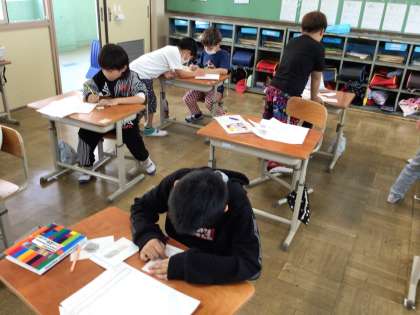 先日行った学校探検で見つけたものを絵に描いています。1年生に教えてあげたいことを中心にまとめていきました。