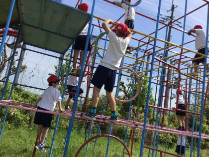 体育の時には、遊具遊びをしています。2年生は3階まで行けます。初めは高い場所や滑り台もこわごわでしたが、気をつけて楽しみました。