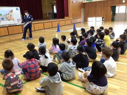 伏見署のお巡りさんが交通安全についてのお話を聞きました。車や自転車などに気をつけて、道路を横断する練習をしました。