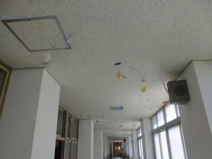 廊下の飾りつけが新しくなりました。可愛い魚が風に揺られていますよ。