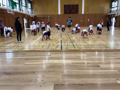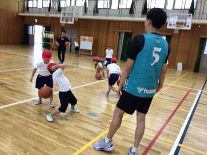 今日はハンナリーズのコーチと選手と、ボールを使った体験をしました。普段はしない体の動きをしたり、選手の方に手本を見せていただいたり・・・楽しい時間を過ごしました。