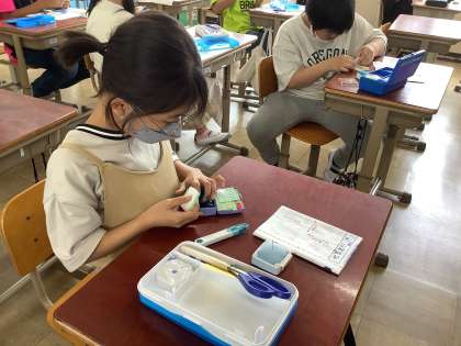 「裁縫」の学習が始まりました。今日は針に糸を通す練習をしました。先生の話を聞いて真剣に取り組んでいました。