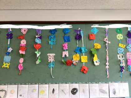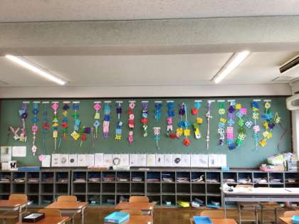 以前に作ったかざりを後ろの掲示板に貼りました。風が吹くとひらひらと飾りが動くので、綺麗です。