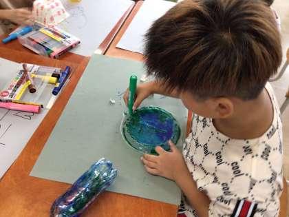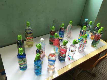 図画工作の時間に生活で使っている500mlのペットボトルを色付けしました。この日は曇り空だったので、綺麗に光りませんでした。
