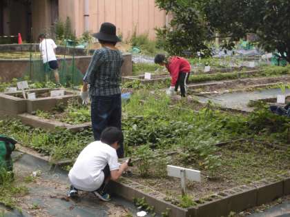 畑の世話をしています。大きく育つように手入れをしています。