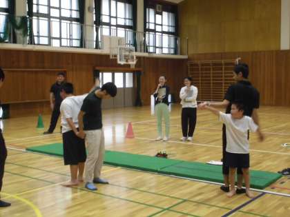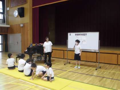 4組で取り組んでいるリトミックをたくさんの先生方にみていただきました。自己紹介をしたり、先生とペアを組んで活動したりと盛りだくさんでした。とても頑張っている姿をみてもらいとても嬉しそうでした。