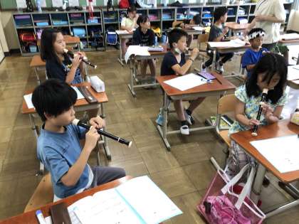 リコーダーの学習が進んでいます。吹ける音が増えて、曲の演奏を始めました。