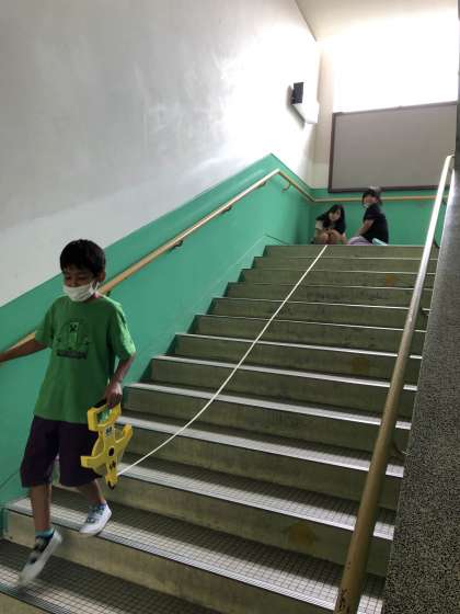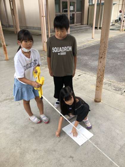 巻き尺を使い教室からの距離をはかりました。予想よりも長く驚いていました。