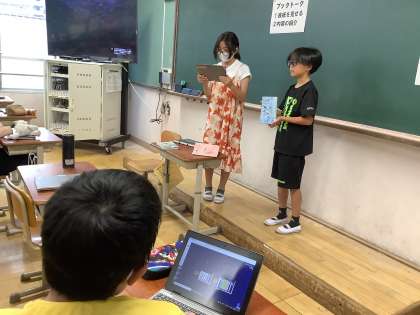 今日の高学年ユニットの「朝の縦割り活動」の時間は、国語の学習で準備をしてきたブックトークをしました。それぞれおすすめの本を紹介しました。