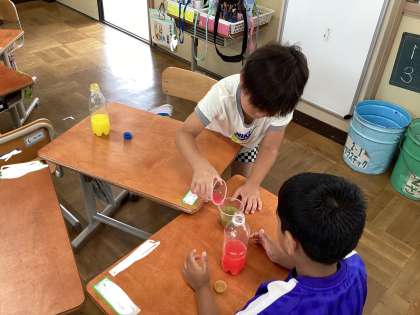 今回の図画工作では、自分で色水を作り友達と協力しながら、自分の色を作りました。素敵な色がたくさん作れました。