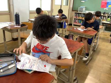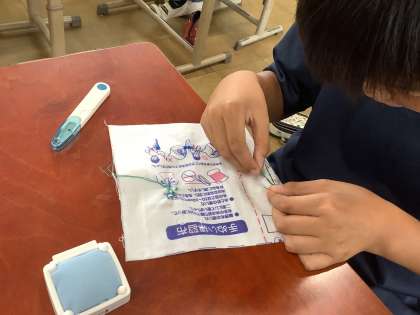 今学期最後の家庭科の学習では、裁縫の「半返しぬい」に挑戦しました。「難しい〜!」などと言いながらも、みんながんばっていました。