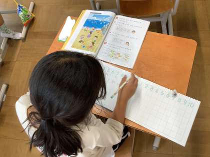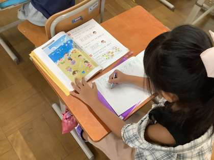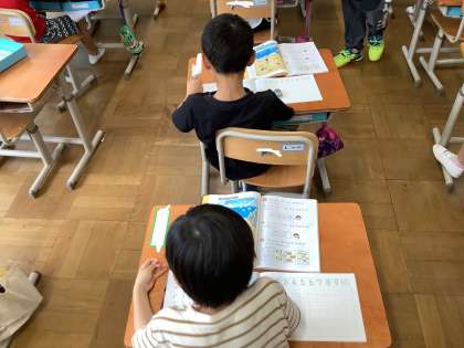 算数では、教科書の絵を見て、お話を作りました。たし算・引き算の言葉を使って、お話を考えていました。