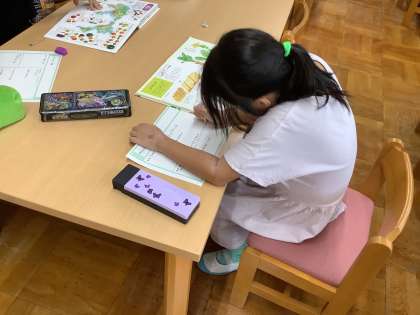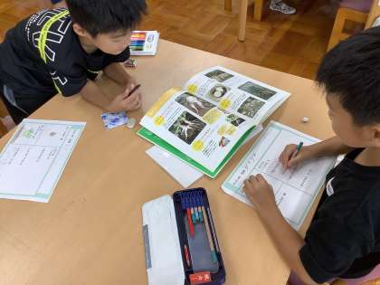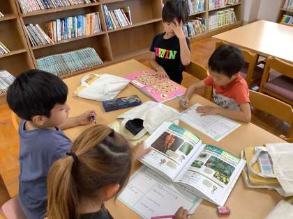 2年生の生活では、秋から育てたい野菜について調べています。メディアセンターで図書から必要な情報を取れるようになってきました。友だちと教え合っている姿も素敵です。