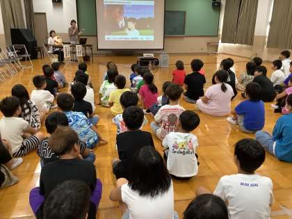 学校にサラブレット・ミニチュア・ポニーがやってきました。はじめは多目的室でお話を聞きました。初めて知ることや驚いたことなどがあった様子です。