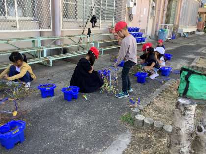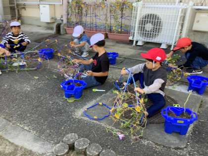 5月から育てていたアサガオのつるを使って、リースを作りました。何回かリースを作る練習をしましたが、今日は1人で作りました。少し難しいところは友だちと協力しながら、作りました。
