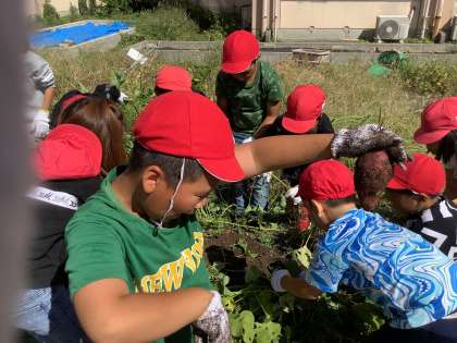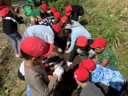 みんなで植えた芋のつるが長く伸びて、成長しました。今日は、さつまいもを掘ってみました。土の中からさつまいもが顔を出しました。教室でみんなで観察しました。色や形をじっくりみたり、触ったり、ヒゲを絵に描いたりとしっかり観察できました。収穫の喜びを感じることができました。