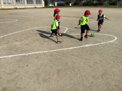 1年生は「すばやく転がす」や「ボールをかわす」などのめあてにゲームをしています。今回は、コートも工夫しました。ハートの形でゲームしました。逃げる場所を工夫したり、ジャンプでコート内を移動してみたりなど楽しくゲームができました。