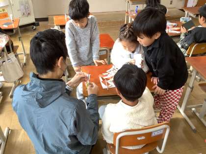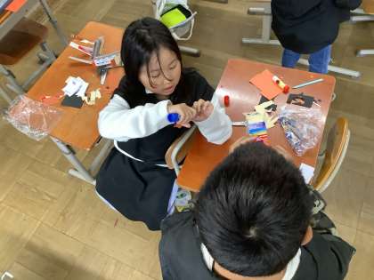 馬のおもちゃの仕上げをしています。みんなで教え合いながら、作っていました。