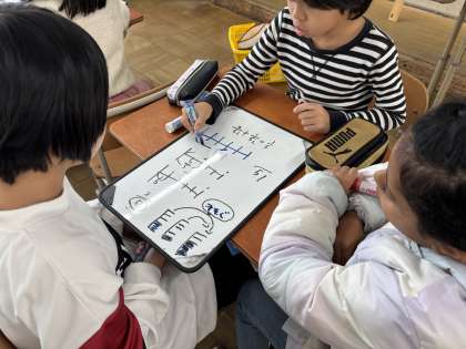 分母が同じたし算の仕方について、グループで話し合って考えました。ホワイトボードに考えを書いて説明していました。
