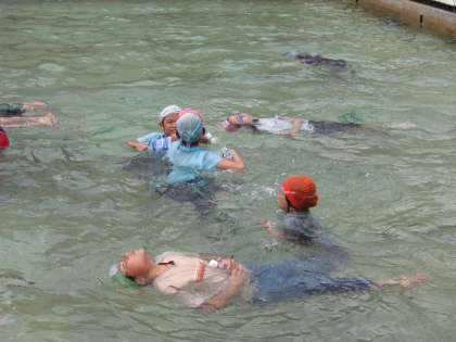 いざ,服を着てプールの中に!!歩くだけで,「重い。」「進まない・・」泳ぐなんて出来そうにありません。でも,講師の先生の「人間は,水に浮く」の言葉通り,胸とおなかにいっぱい空気を吸い込んで力をぬいて水によこたわると,子どもたちはフワリと浮いてきました。逆に,体の中の空気を全部はき出すと,アララ・・今度は体がスーと沈んでしまいました。体の中にある”うきぶくろ”を上手に使って,落ち着いて対処することが大事だと教わりました。その後,水着だけになって泳いだら「動きやすい。」「泳げる!」と歓声があがっていました。夏休み,川や海で安全に過ごし楽しい思い出ができることを願っています。
