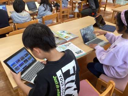 グループごとに、国について調べていました。メディアセンターで本やインターネットで必要な情報を探しています。