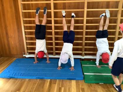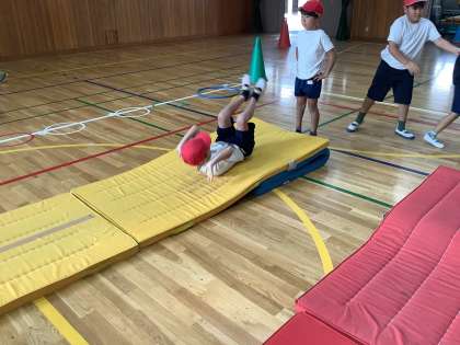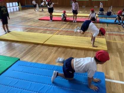 低学年の体育ではサーキットでいろいろな技をしながら、アップをしています。1・2年生のペアで声をかけながら学習しています。サーキットの後は、個別に取り組みたい技にチャレンジしています。